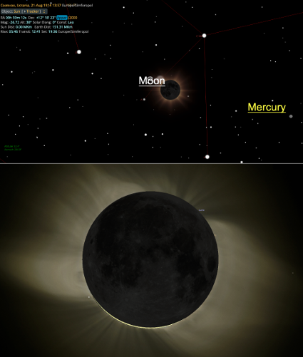 Apariencia del cielo en torno al Sol en el eclipse del 21 de agosto de 1914 desde la península de Crimea. Arriba: imagen cortesía de The Sky Live.  Abajo: simulación de Stellarium para la misma fecha y ubicación.  (La estrella más próxima al limbo en la parte izquierda de la imagen es GM Leonis – HD 87271, estrella variable pulsante de magnitud 7.10)
