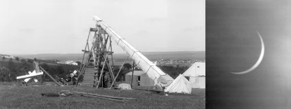 Instrumentos del ONA (Observatorio Nacional de Argentina) instalados en Feodosia, para la observación del eclipse del 21 de agosto de 1914. A la derecha, una de las pocas fotografías que se pudieron obtener entre nubes