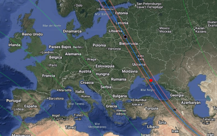 Trazado del eclipse de 1914 por Xavier Jubier. La estrella roja marca el lugar de observación elegido, Feodosia (península de Crimea)