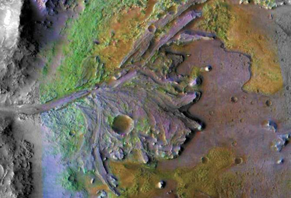 La fotografía del cráter Jezero en Marte, en falso color, muestra en verde los carbonatos, minerales cuya formación requiere entornos abundantes en agua.