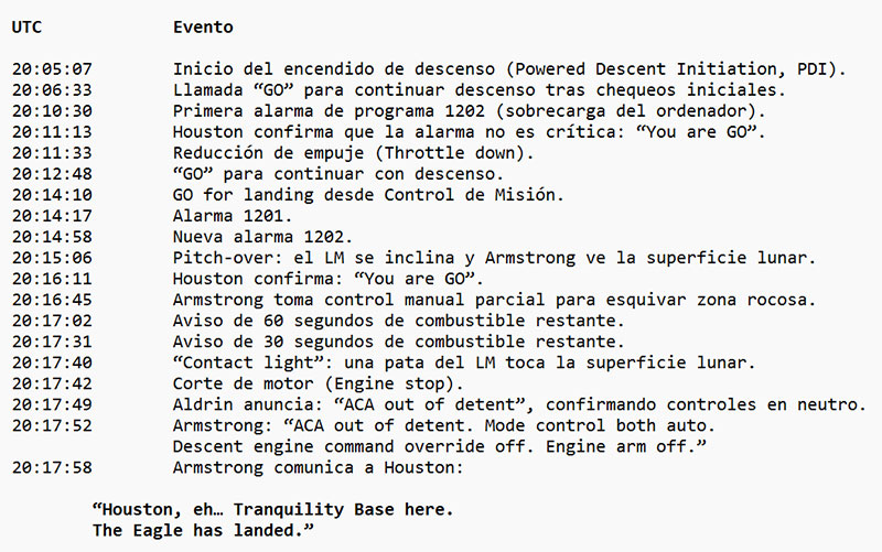 No parece muy saludable que un evento del que está pendiente el mundo entero y en el que hay tanto en juego, se resuelva con un margen de tan pocos segundos. Pero los astronautas, que hacían lo que mejor saben, pilotar, estaban preparados para eso. Armstrong lo sabía y también sus compañeros Aldrin en el Eagle, Collins en el Columbia y Charlie Duke en Houston, actuando como CAPCOM.