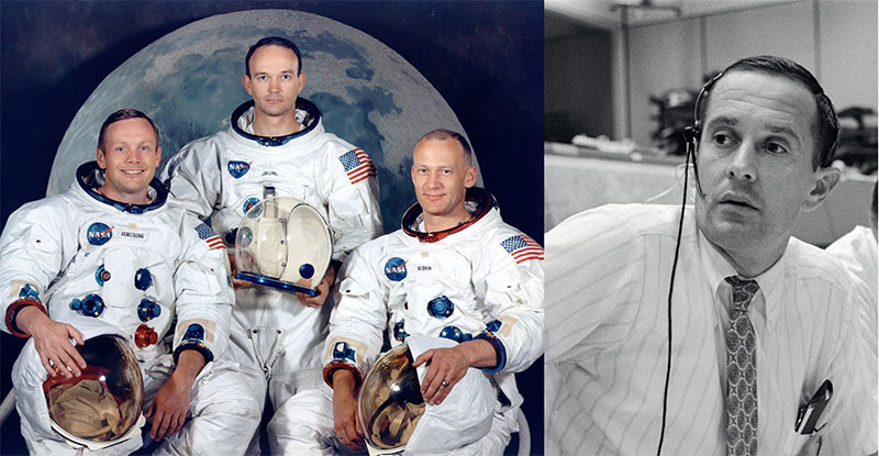 Composición de elaboración propia a partir de la foto oficial de la tripulación del Apolo 11 y otra del CAPCOM . Fuentes: Wikipedia y Wikipedia. Dominio público.
