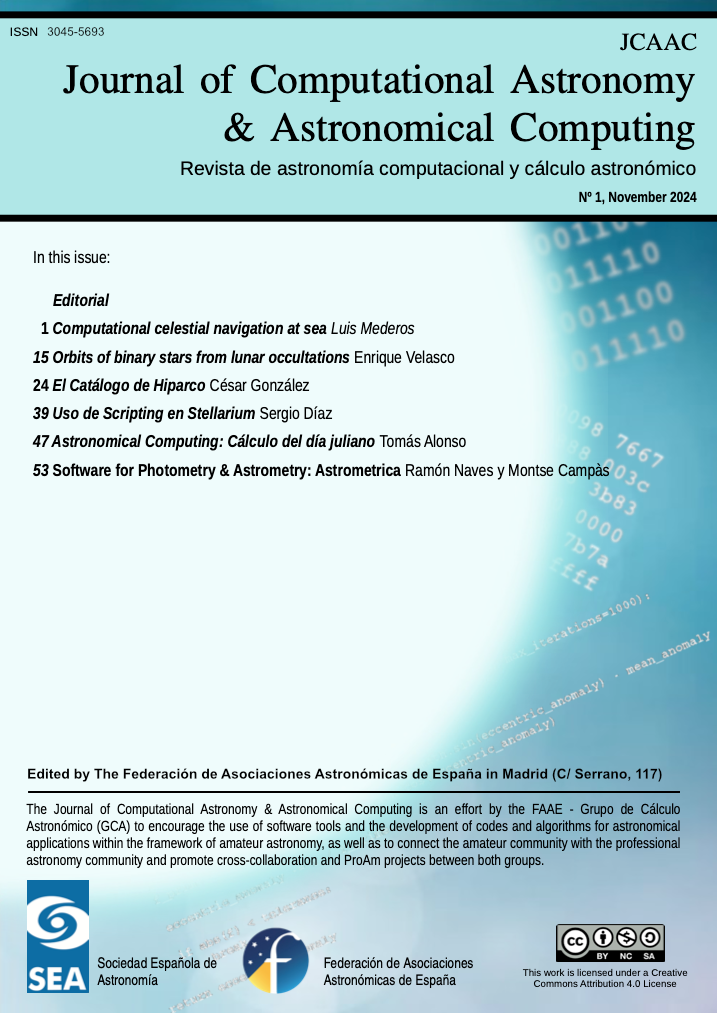 The Journal of Computational Astronomy & Astronomical Computing is an effort by the FAAE - Grupo de Cálculo Astronómico (GCA) to encourage the use of software tools and the development of codes and algorithms for astronomical applications within the framework of amateur astronomy, as well as to connect the amateur community with the professional astronomy community and promote cross-collaboration and ProAm projects between both groups.