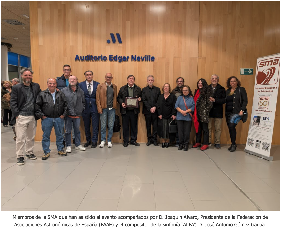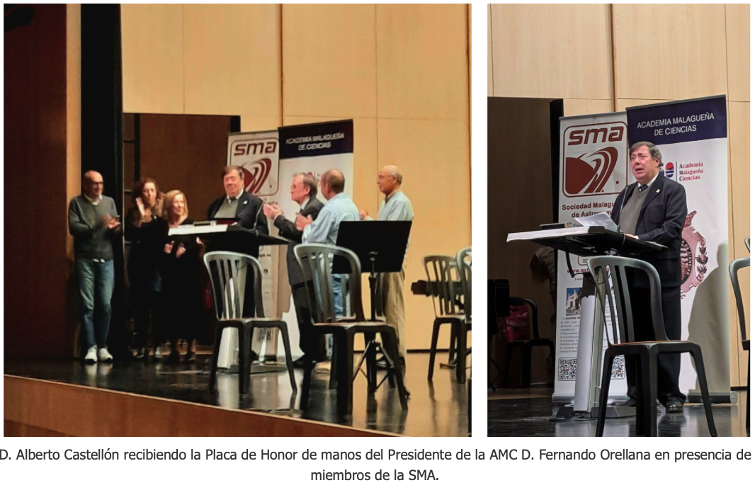 El jueves 4 de diciembre de 2025 tuvo lugar el acto de entrega de la Placa de Honor que la Academia Malagueña de Ciencias (AMC) concede muy excepcionalmente a entidades destacadas por su actividad científica. En esta ocasión este reconocimiento ha recaído en la Sociedad Malagueña de Astronomía (SMA), coincidiendo con las actividades de su 50 Aniversario. El evento se ha celebrado en el auditorio Edgar Neville gracias a la gentileza de la Diputación de Málaga.